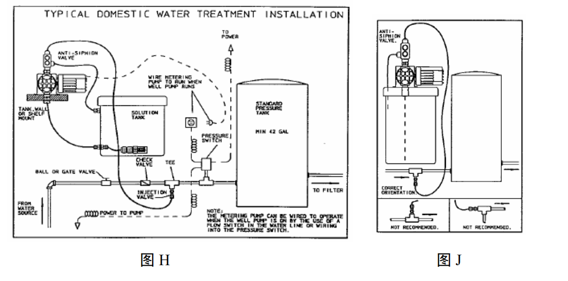 注射背压阀应安装在主流管路上,典型安装如图 H。.若泵的安装是为了处理游泳池水则还要安装一个独立的转换器或 RCD。